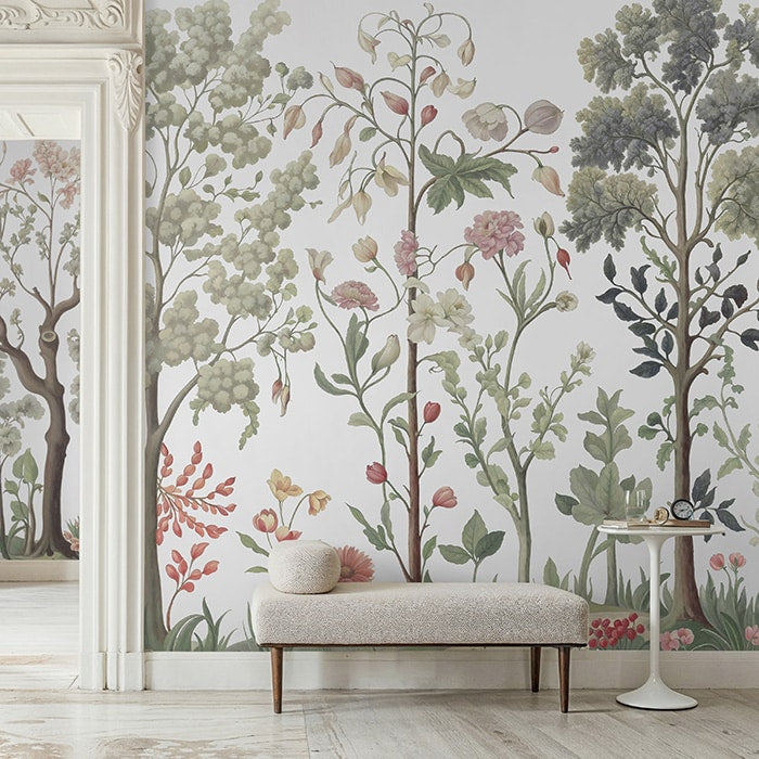 A playful mix of florals and lush greenery in a sophisticated palette of colours, the Arboretum is a modern chinoiserie style wall panel that is a breathtaking addition to any interior.