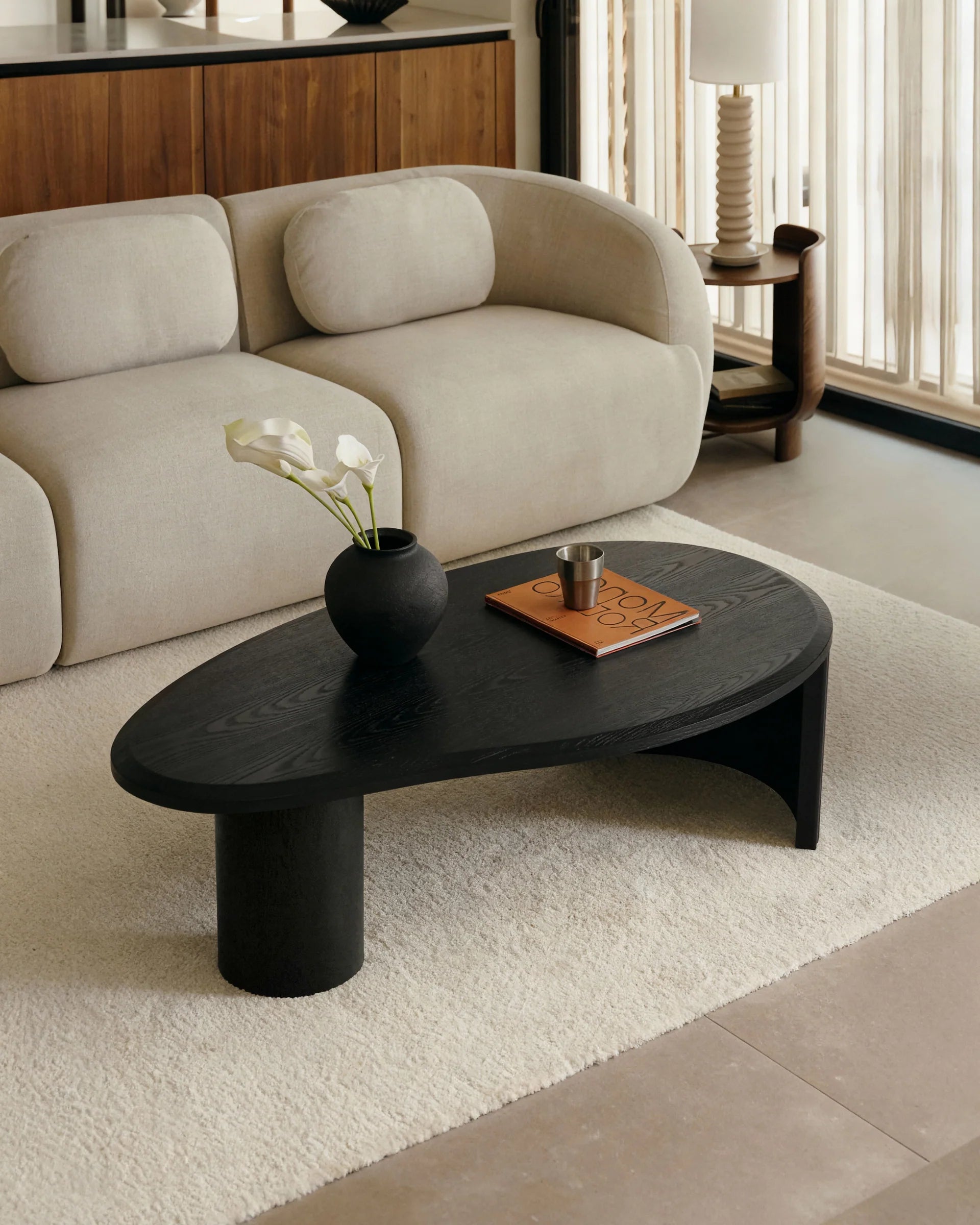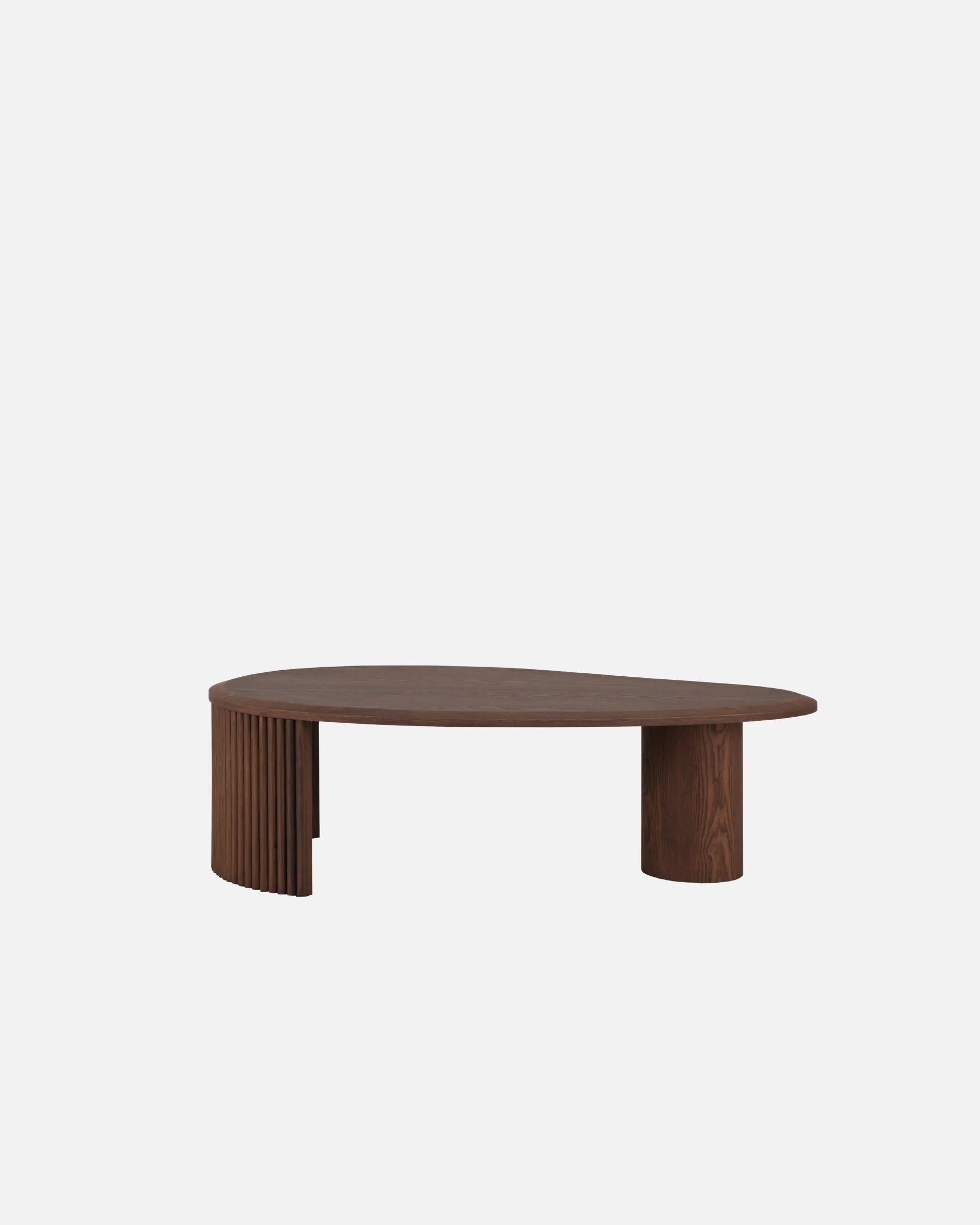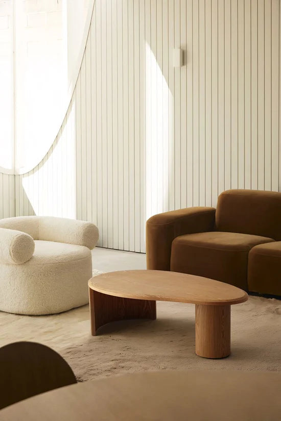 The Elm Coffee Table combines a soft, organic form with architectural detailing. Its asymmetrical pebble silhouette brings sculptural presence to contemporary interiors, while contrasting legs, one ribbed curve, one smooth cylinder, create dynamic visual rhythm from every angle.